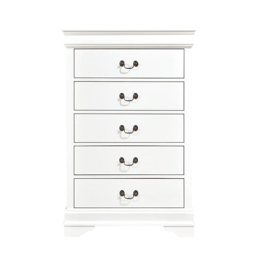 Mayville Collection by Homelegance Furniture White finish 5 Drawers Antiqued metal bale hardware Distinct framing